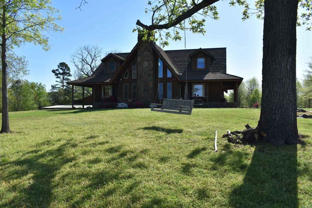 The mountain views in nearly every direction from the wrap around porch of this two-story home are nothing short of awe inspiring! This 4900 square foot log siding home is perched atop a small knoll near the back of the 15 +/- acres that surround it. The home not only boasts an amount of square footage that is hard to find, but a combination of rustic finishes and beautiful craftsmanship. As you walk up the stone walkway to the front of the home, you will notice the beautiful masonry around the wrap around porches, the perfect place to enjoy a cup of coffee as you watch the sunrise over the Ouachita Mountains. The main level of the home has a large living room with a vaulted ceiling and fireplace, and windows with views of the mountains. The spaciously designed floorplan has two bedrooms and two full baths on the main level of the home, accompanied by a large laundry room just off of the two-car carport. Upstairs, two suite style bedrooms are connected by a loft overlooking the living room. The full basement downstairs is the perfect quite space for a home gym, office, or separate living quarters. There is a half bath, as well as a walkout door to the rear of the home.