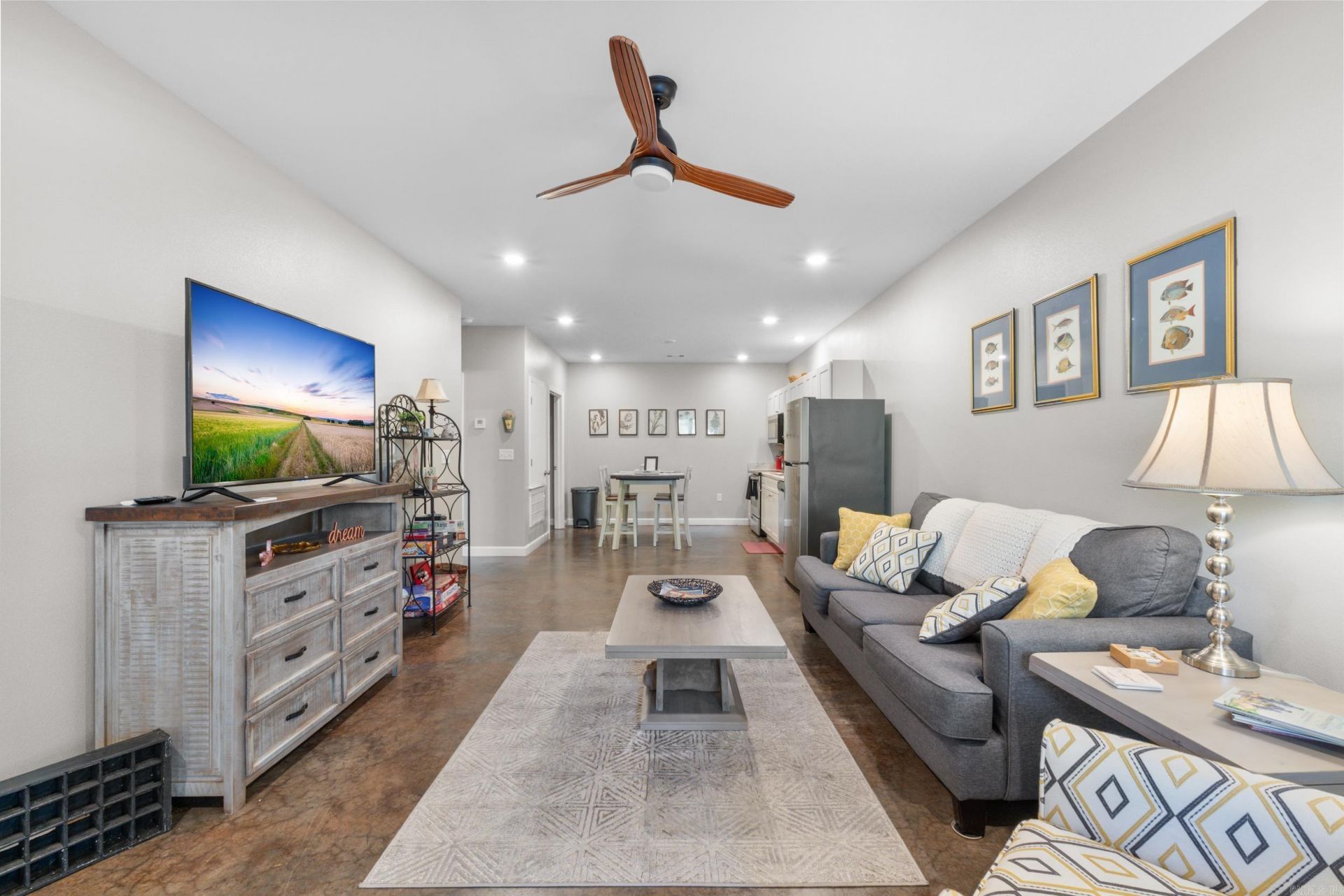 Welcome to your perfect lake getaway! This like-new 1 bedroom, 1 bath condo borders the Government Strip, offering added privacy and a natural buffer , with a seasonal view of beautiful Bull Shoals Lake and Bull Shoals Marina. Built just four years ago, this well maintained condo features an open concept floor plan designed for easy living and entertaining. The interior boasts durable acid stained floors, a convenient laundry room, and a bright, inviting living space. The large primary bedroom features a walk-in closet. The bathroom features a large vanity and tub/shower combo. Step outside and enjoy an impressive 370 square feet of outdoor living, on your oversized porch or the large common area, located on the side of the property for family gatherings and cookouts and complete with bathrooms for your guests. Located just a few miles from the renowned White River, famous for its world-class trout fishing, crystal-clear waters, and year-round outdoor recreation, this property offers the best of both lake and river lifestyles. Currently used as a short-term rental, this property comes fully furnished.
