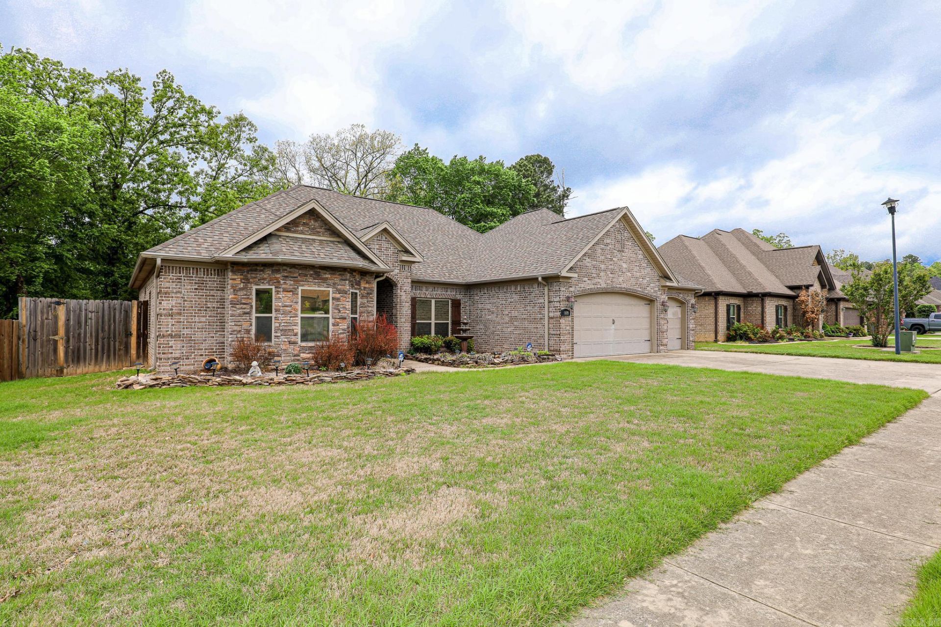This beautiful home blends the traditional style of a brick and stone front elevation plus a three car garage that offers ample parking and storage. Inside are rich hardwood floors in the living area, hallways and separate dining room. Spacious kitchen with granite counters, gas stove, bar, stainless appliances and pantry. A drop zone as you come in from in from the garage for personal items. Separate laundry room. Split bedroom arrangement. Covered back porch and privacy fenced yard. Convenient location for access to all area amenities.